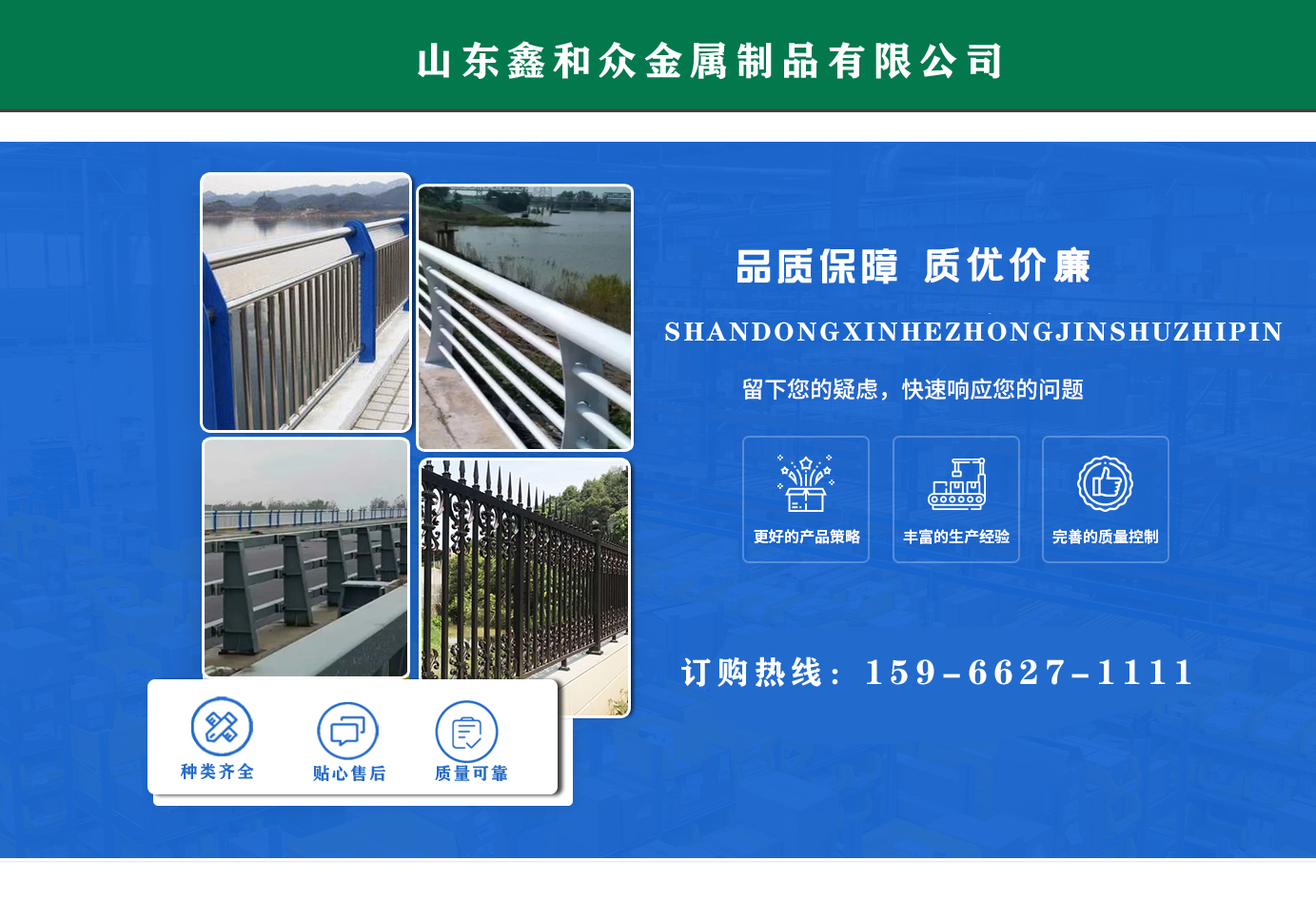 山東鑫和眾金屬制品有限公司主要產(chǎn)品有防撞護(hù)欄,橋梁護(hù)欄,道路護(hù)欄,河道護(hù)欄,不銹鋼護(hù)欄等護(hù)欄。提供設(shè)計(jì)方案,一站式定制,包您滿意價(jià)格優(yōu)惠,歡迎來(lái)電咨詢(xún)! 公司常年從事銷(xiāo)售護(hù)欄防撞護(hù)欄,橋梁護(hù)欄,道路護(hù)欄,河道護(hù)欄,不銹鋼護(hù)欄,橋梁鋼護(hù)欄,河道燈光護(hù)欄等。產(chǎn)品廣泛應(yīng)用于橋梁、河道、旅游景區(qū)、道路、公路、公園、小區(qū)、景觀、道路防撞等領(lǐng)域。 公司產(chǎn)品均采用優(yōu)質(zhì)不銹鋼材料,符合相關(guān)標(biāo)準(zhǔn)。各種型號(hào)不銹鋼復(fù)合管及護(hù)欄,質(zhì)量嚴(yán)格把控。產(chǎn)品強(qiáng)度高、耐腐蝕、焊接牢固、抗沖擊、性能好,防撞護(hù)欄結(jié)構(gòu)簡(jiǎn)單、美觀實(shí)用大方。 歡迎前來(lái)訂購(gòu)!...